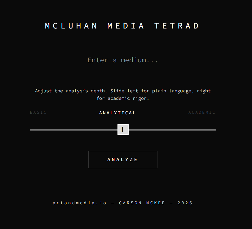 A media tetrad analyzer artifact featuring a variable output slider (basic-analytical-academic) for media research.
